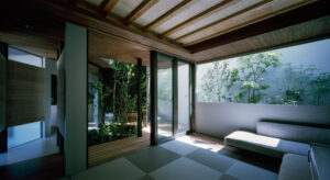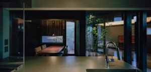 キッチンからの眺めは坪庭の奥にリビングが覗ける開放的な空間になっています。